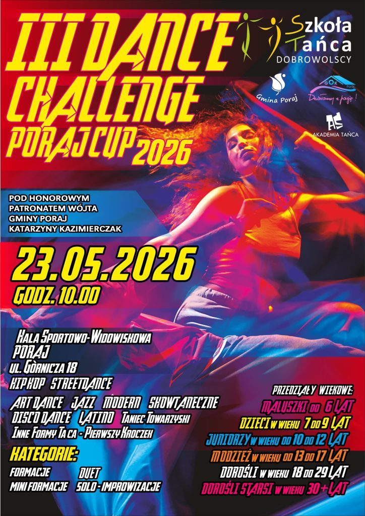 III DANCE CHALLENGE PORAJ CUP 2026 KARTA ZGŁOSZEŃ Wszystkie zgłoszenia są zgłaszane przez konto klubowe DZWOŃ DO NAS JEŻELI MASZ PYTANIA Kierownictwo turnieju TEL. 690012507Adrian Dobrowolskitel. 506785852Adam Szendzielorz ADreS: biuro@dancechallengecup.pl